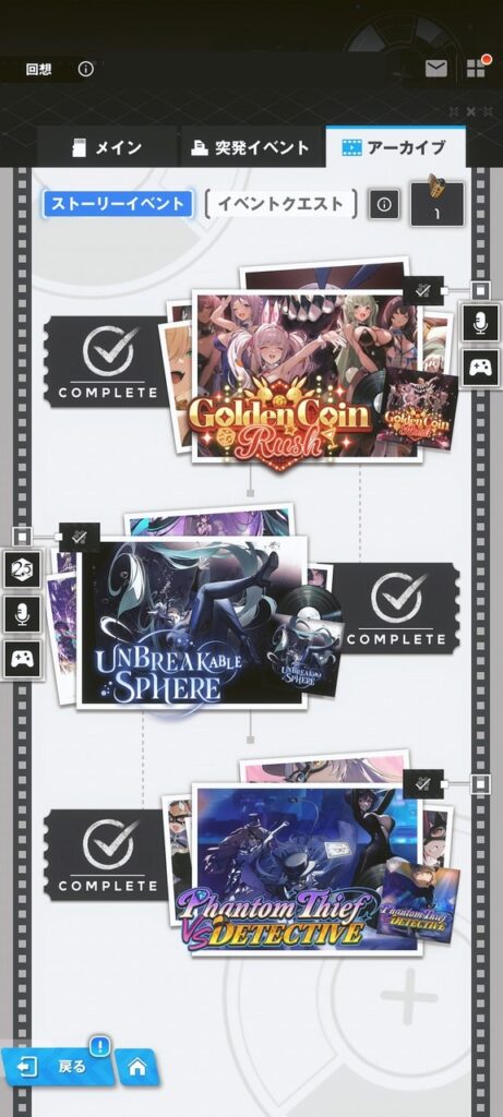 アーカイブコンテンツで遊びたくなったときは、先ほどと同じようにコマンドセンター⇒回想⇒アーカイブと進んでコンテンツを選びます。一度解放したコンテンツは「メモリーフィルム」を消費せずにいつでも遊べます。