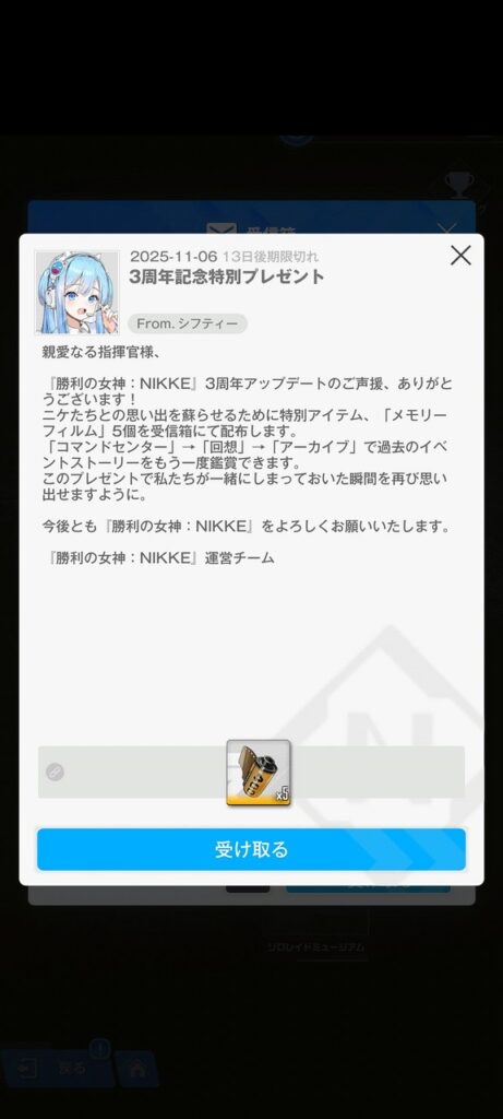 3周年イベント中の2025年11月6日付けで急遽、メモリーフィルムx5が配布されました。受取期間は11月18日ごろまでです。