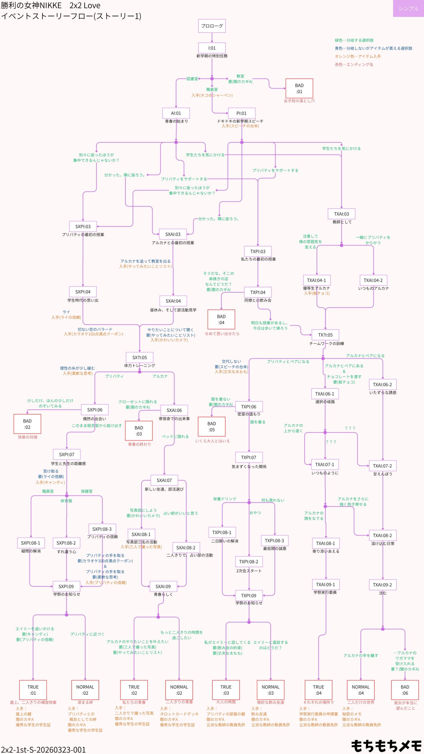 ゲーム中のストーリーフローに準じた、シンプルなフローです。実際の分岐は、選択肢に順序があるところがあり、もう少し複雑な箇所があります。