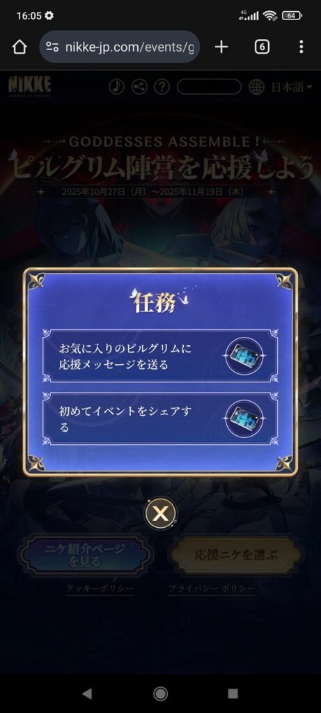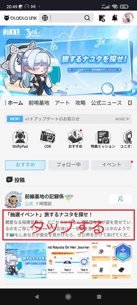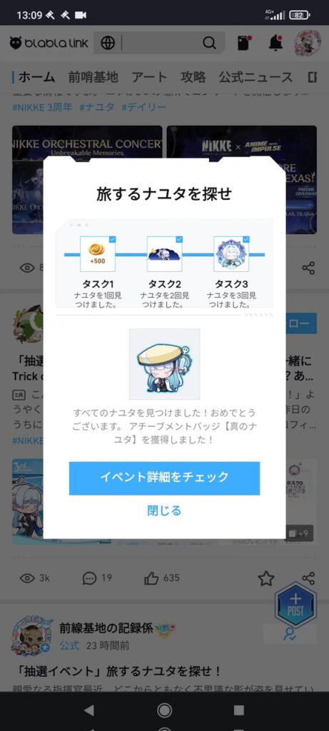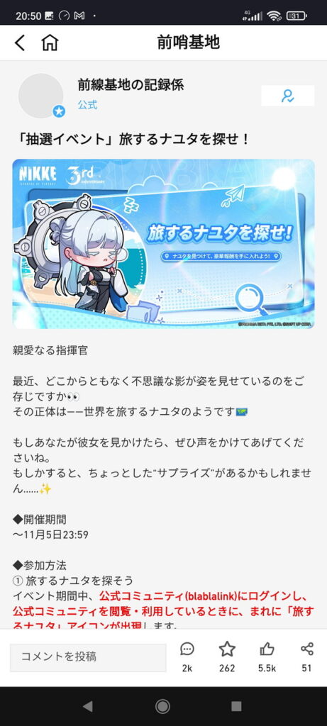 正確にはBlablaLinkのイベントではなく、勝利の女神NIKKE公式の写真撮影イベントです(そのためか、BlablaLinkからのアクセス経路が見つからなくて困る)。