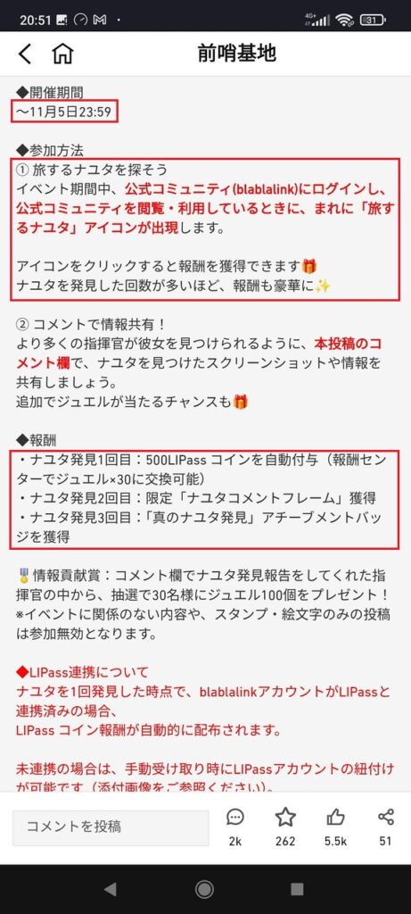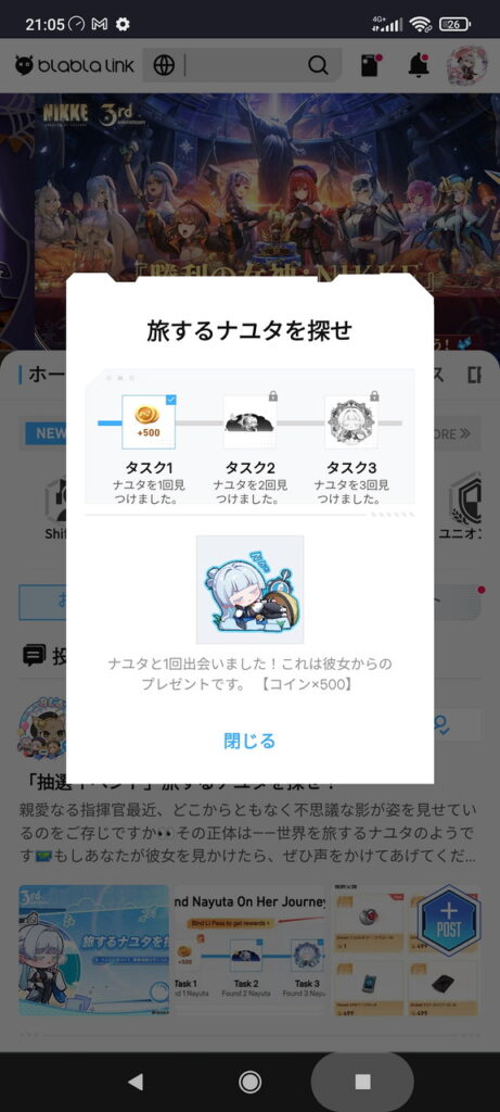 BlablaLinkの特典ミッションに期限はありませんが、入手は各1回のみで復活はしません。以前に完了した方は再入手できません。
