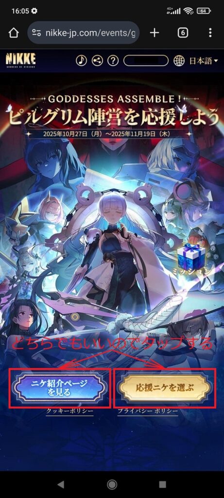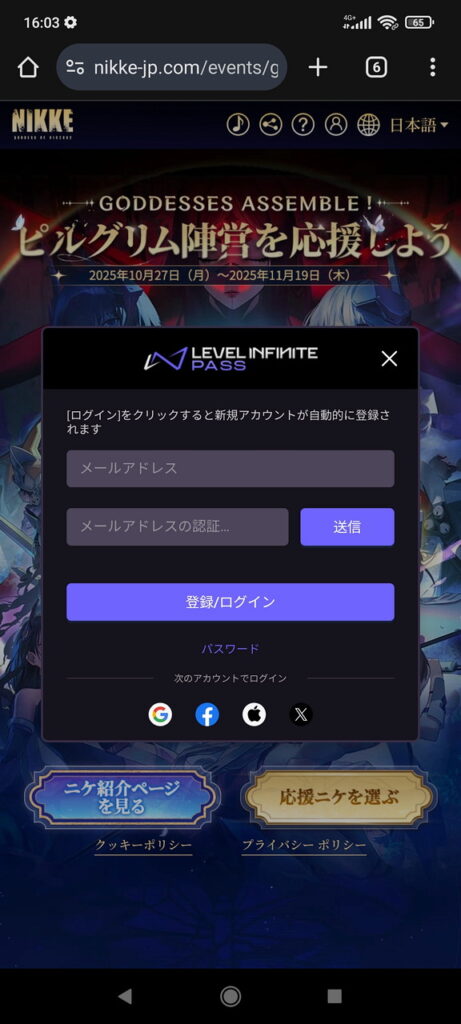 ログイン画面が表示されます。今遊んでいる勝利の女神NIKKEアカウントと同じものでログインしてください。