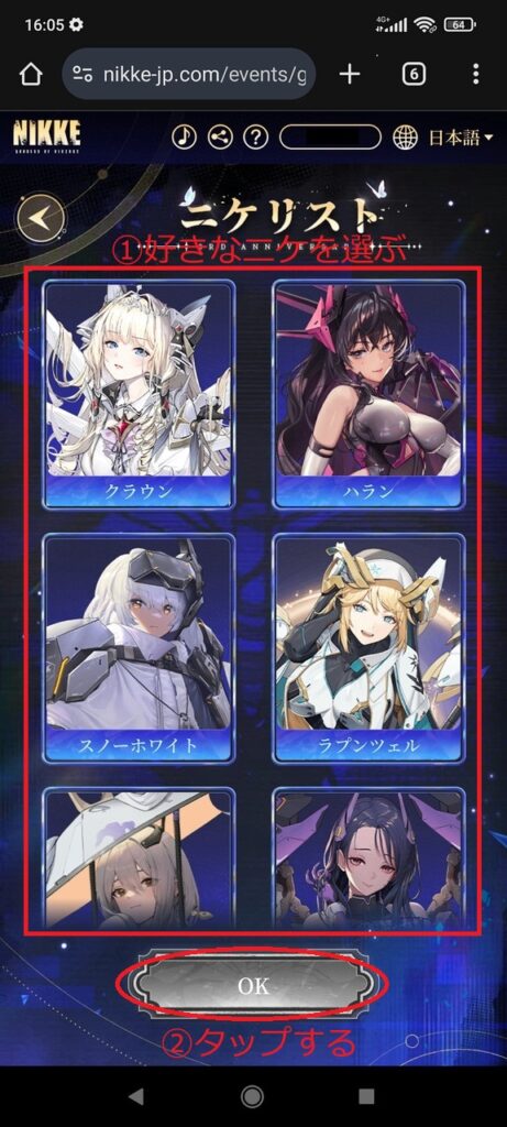 勝利の女神NIKKEを遊んでいるサーバーを選択します。