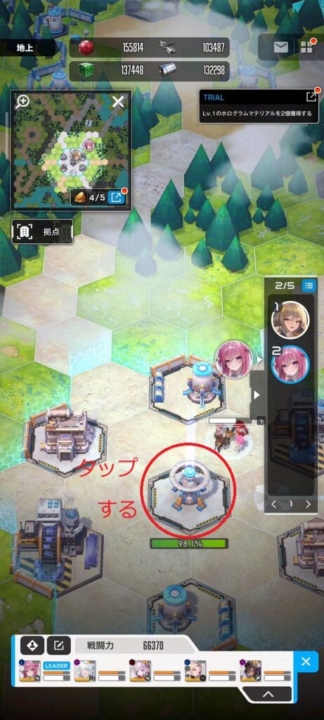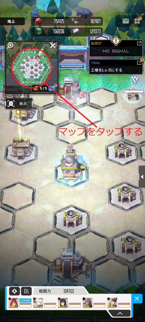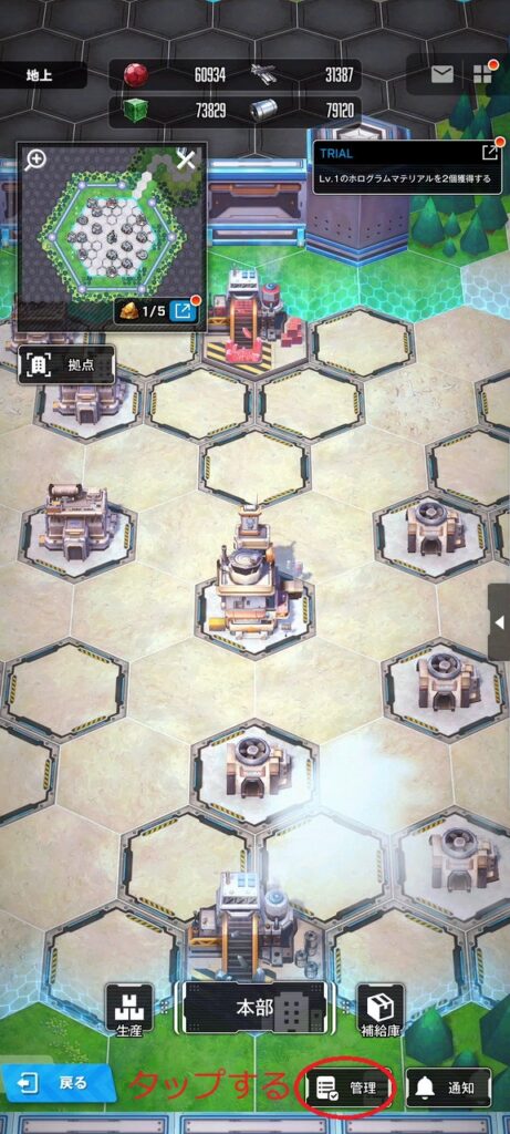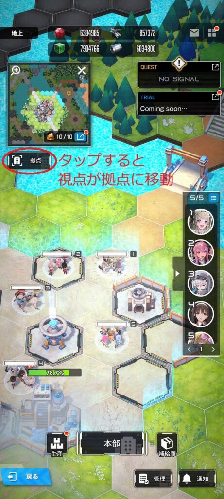 画面左上、マップの下に表示されている「拠点」をタップします。