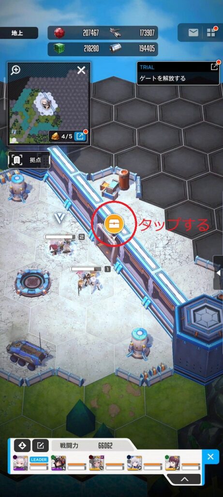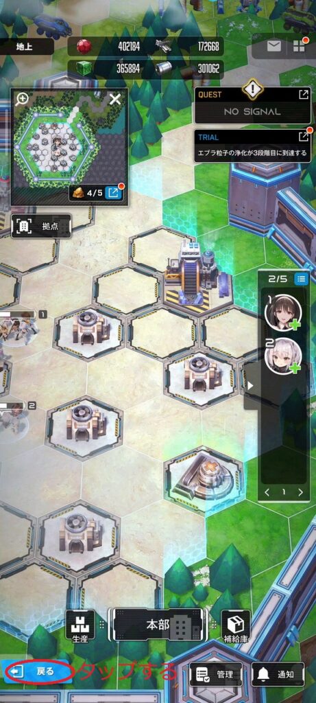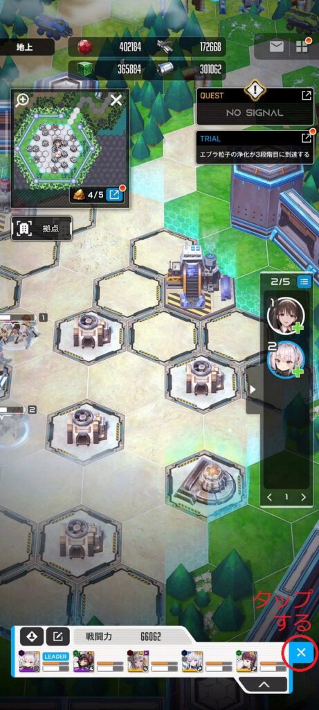 部隊メニューが出ているときは、画面下の編成ウインドウ右端の「×」をタップします。