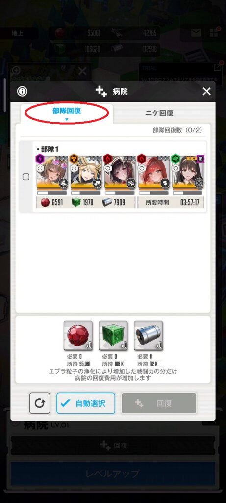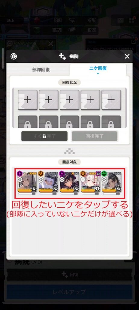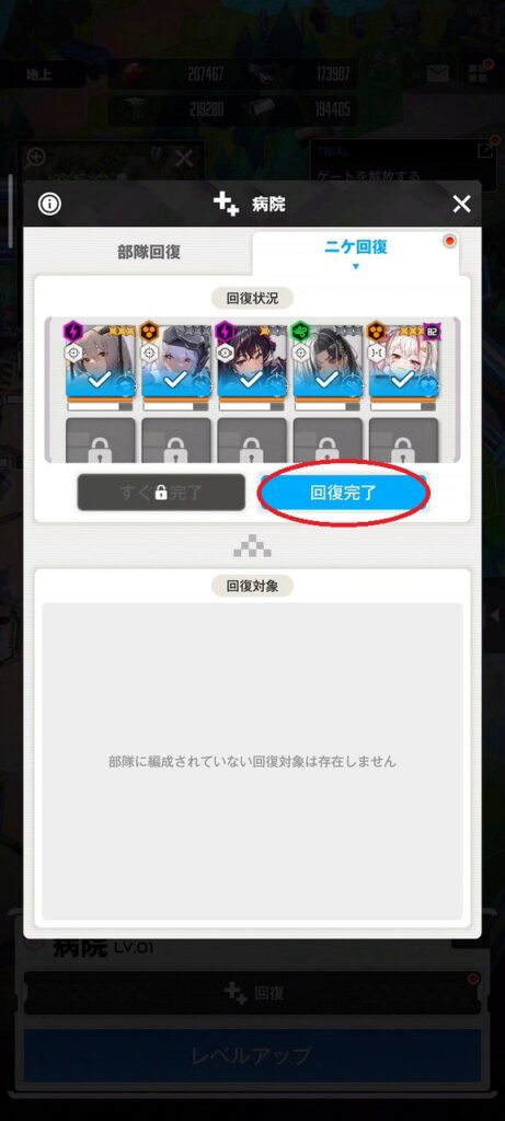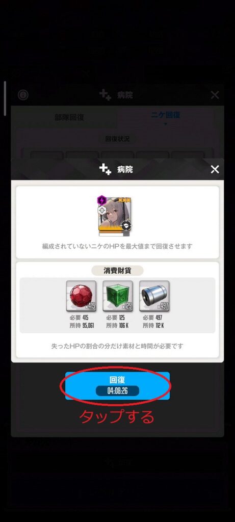 他のメンバーで探索をしたいなら、「ニケ回復」で個別に回復すると良いのですが…。回復時間は「部隊回復」の16倍ほどかかります。