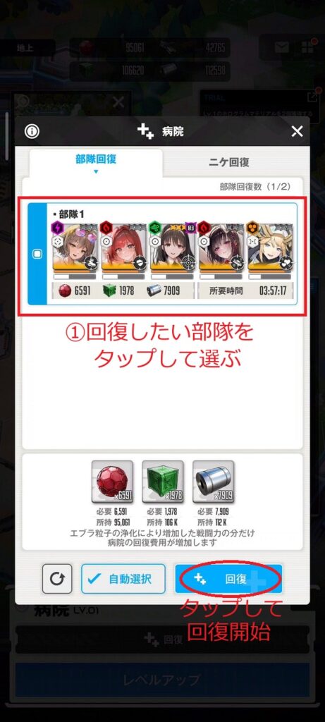 回復したい部隊をタップして選び、「回復」をタップすれば回復が始まります。