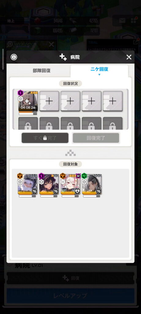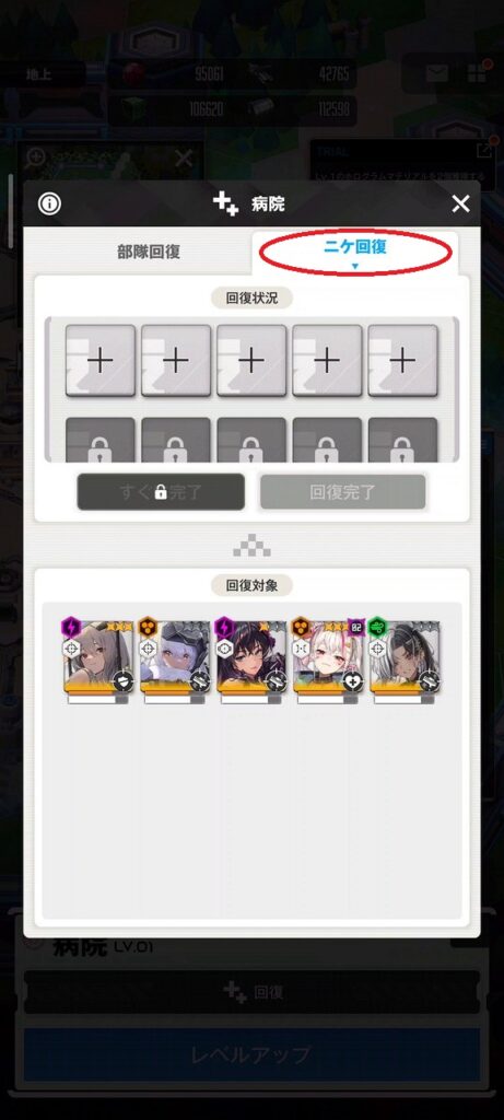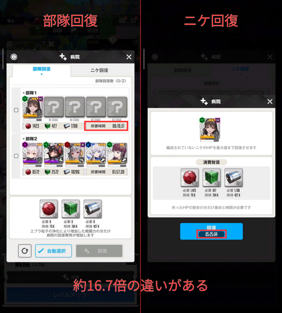 | ニケ回復 | 部隊から外れた ニケを個別で 回復する | 他のメンバーで 部隊は行動できる | 回復時間が 長い (部隊回復の 約16倍!) |