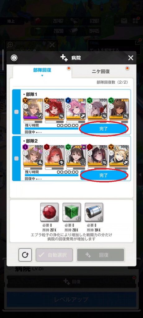 どちらの回復方法の場合でも、ニケの体力回復が完了したら、手動で「完了」をタップする必要があります!