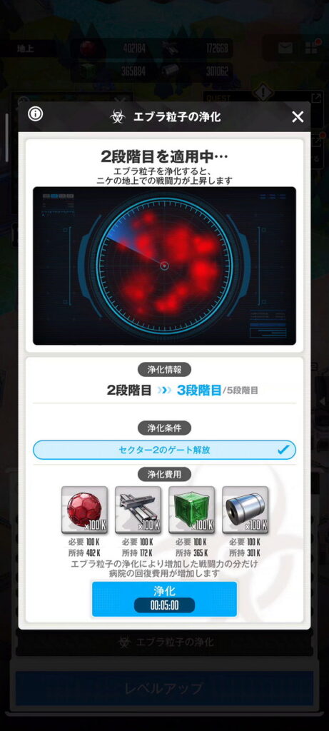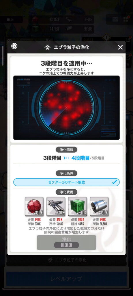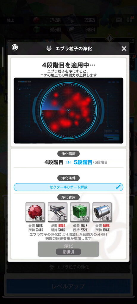 - エブラ粒子浄化や施設強化が完了するのに、半日(12時間)の待機時間が発生する