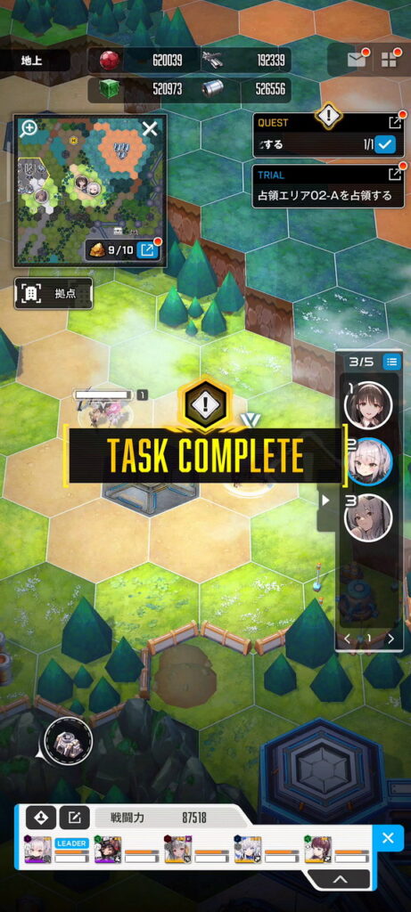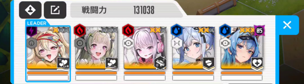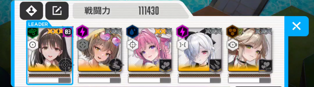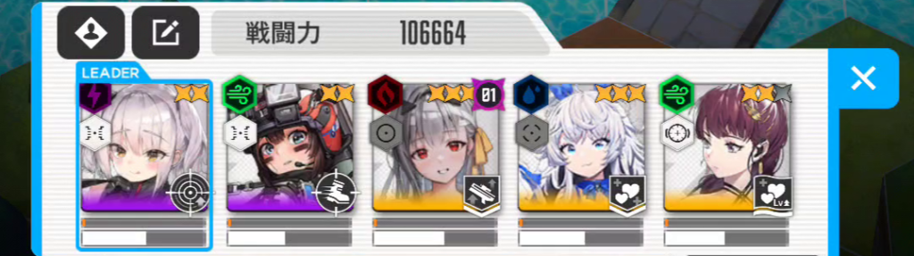 探索・占領戦・ゲート戦をこなす万能型です。探索時の高速起動スキル・探索時の射程距離拡張スキルを各1名入れて、残りは特任部隊+支援部隊で組んでいます。