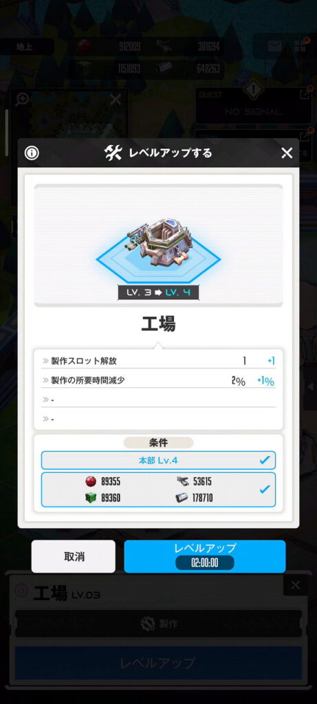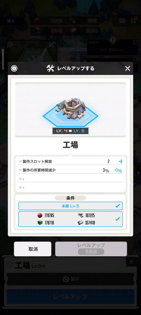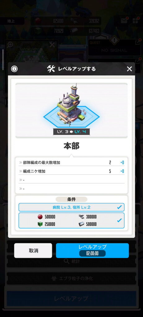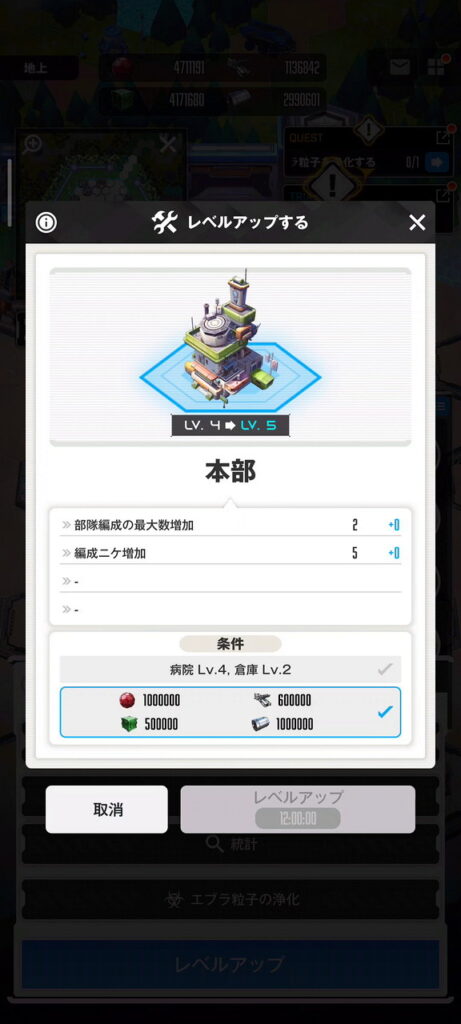 本部をLv.5にするには、以下のA条件とB条件を満たす必要があります。本部Lv.5への強化には大量の素材が必要になる上、12時間の待機時間が発生します。