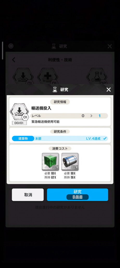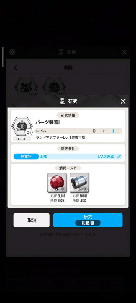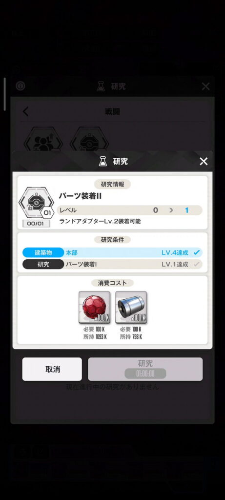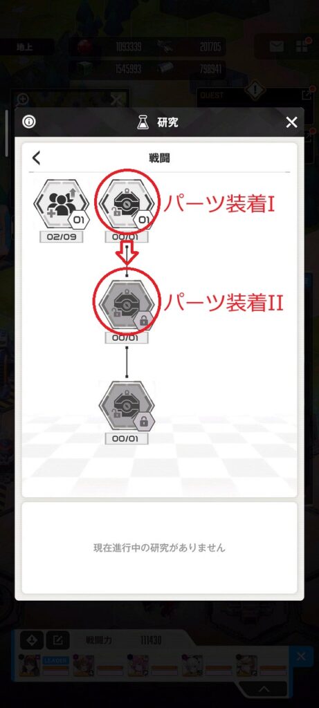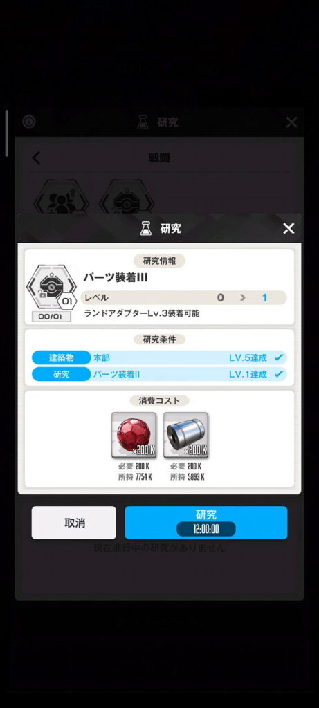 本部の「研究」メニューから「パーツ装着III」を解放します。12時間かかります。