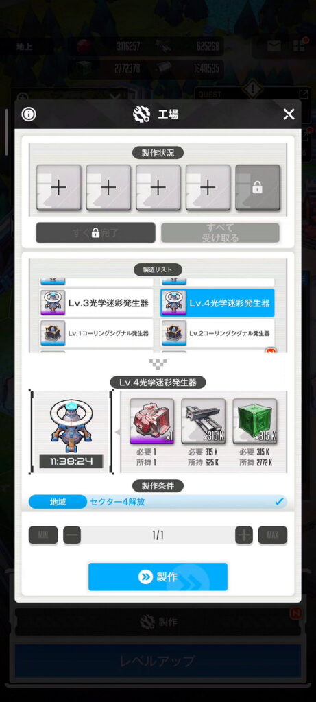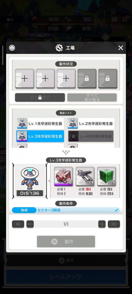 | 1 | 4 | Lv.1光学迷彩発生器を1回製作する |