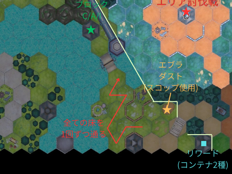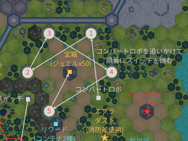マップの最も右上に赤い花が3輪生えたスイッチがあります。灼熱コードのニケを3名含めた部隊でスイッチに乗ると、宝箱が出現します。中身はヘキサブロックx3です。