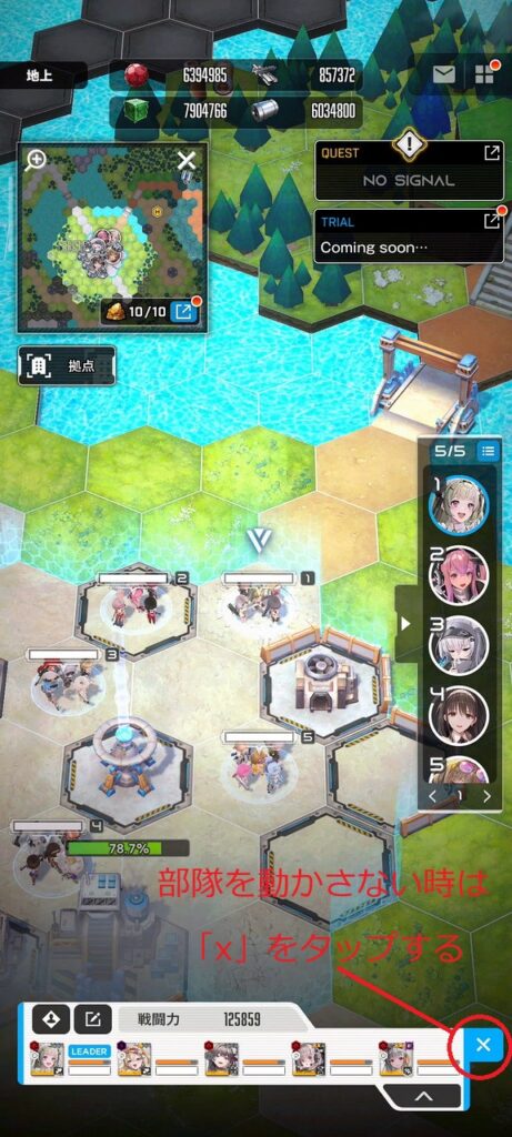選択している部隊を移動したくない時は、画面右下の部隊表示にある「x」をタップしてください。