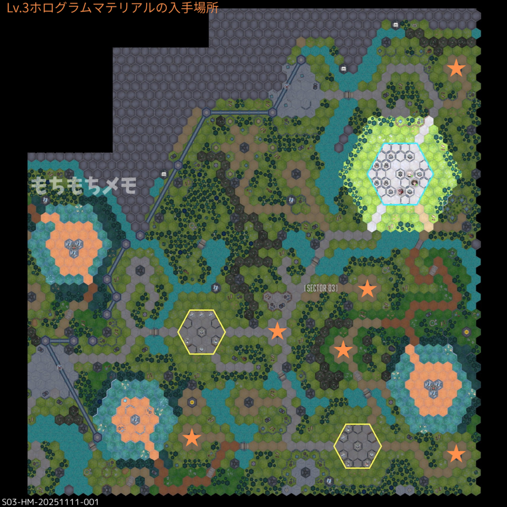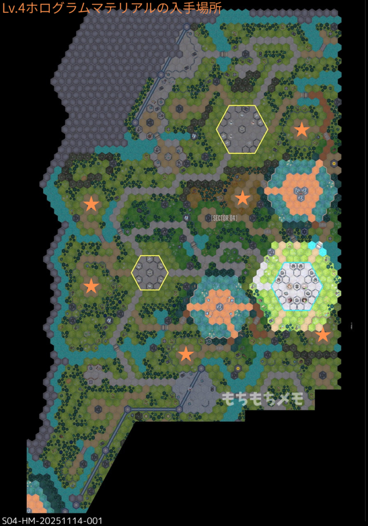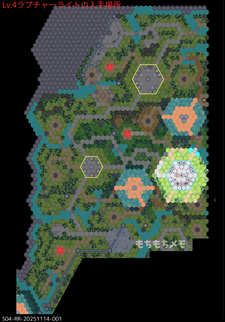 セクター04に入る前に、ラプチャーライトとホログラムマテリアルの位置を確認しておきましょう。フルマップよりも小さいサイズで作りました。どちらも「新しいタブで開く」と拡大できます。