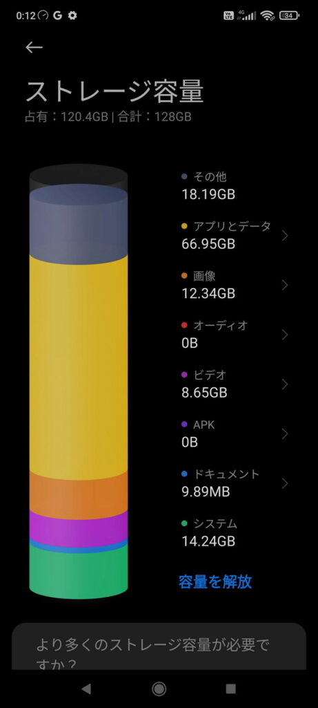 以下、Black Shark 4のストレージ状況です(容量128GB)。そのほとんどを「アプリとデータ」が占めています。