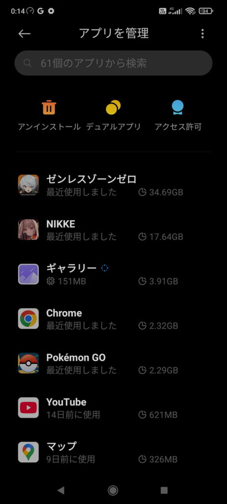 容量順に並べると、「ゼンレスゾーンゼロ」と「勝利の女神NIKKE」がすごい容量を食ってます。2022年以前はポケモンGOのみだったので、ソシャゲがこんなに容量を圧迫するとは知りませんでした。